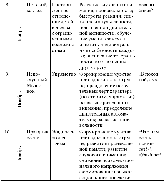 Существует немало апробированных интересных программ для работы педагога-психолога в этом направлении. Среди прочих хочется упомянуть программы Роньжиной А.С. «Занятия психолога с детьми 2–4 лет в период адаптации к дошкольному учреждению» (Роньжина, 2006) и Крюковой С.В. «Давайте жить дружно!», которая впервые была опубликована в издательстве «Генезис» в 1999 году, неоднократно переиздавалась и вошла в этот сборник. В своей работе я активно использовала обе эти программы (первую – для детей 4 лет, вторую – для детей 5–6 лет). Я наблюдала изменения, которые происходят с детьми: они становятся более открытыми, охотно идут на контакт со взрослыми и другими детьми, малыши реже плачут при расставании с родителями.