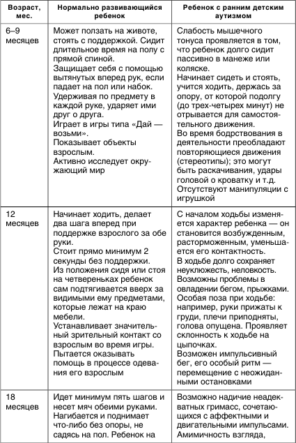 Развитие общей моторики. Первое, на что можно обратить внимание в развитии двигательной сферы у аутичного ребенка раннего возраста, достаточно частые фиксированные нарушения мышечного тонуса (табл. 1).