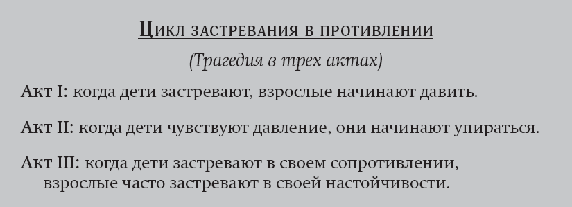 Когда ребенок застревает в реакции противления из-за проблем с привязанностью, у него пропадает мотивация быть преданным, оправдывать ожидания, внимать и слушаться, уважать или стараться ради своего взрослого. Такой ребенок повернется «отрицательным полюсом» к родителям и будет изо всех сил все саботировать, открыто не повиноваться, противостоять, досаждать или вызывать раздражение. Единственный способ изменить такие реакции – взять на себя ведущую роль, укрепляя отношения и не позволяя себе отдалиться от ребенка. Перекрывание проблемного поведения и отказ сосредоточиваться на происшествиях – это две стратегии, которые также могут помочь предотвратить дальнейшее ухудшение отношений (см. главу 10).