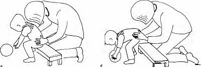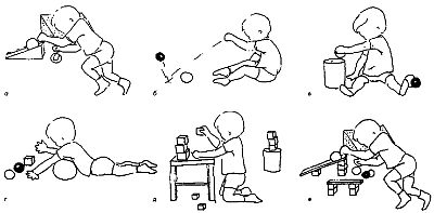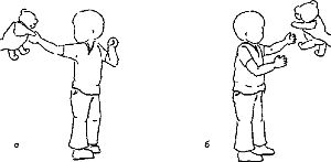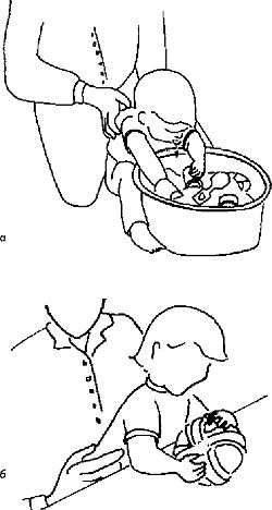 Рис. 13.14. Ребенок, согнув ноги в тазобедренных суставах протягивает прямые руки за мячом (а). Чтобы ему было легче перенести вес тела вперед, малыша поддерживают за туловище или бедра (б).