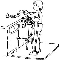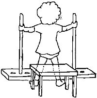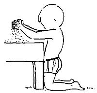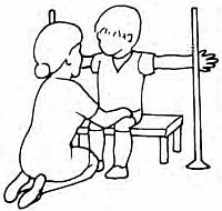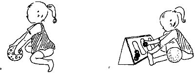 Рис. 13.17. Сочетание хватательных движений рук с другими движениями. Палки вставлены в отверстия по краям доски. Упражнение требует полного разгибания рук. В конце концов палки должны быть вставлены в отверстия доски, которая лежит перед ребенком. Опираясь на палки, ребенок должен вставать и садиться. Кроме того, можно использовать упражнения для рук (рис. 13.16). Доска с отверстиями нужна вначале, поскольку она обеспечивает устойчивость. Когда ребенок сможет ходить, опираясь на палки, доску убирают.