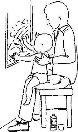 Рис. 13.6. Ребенок сидит верхом на папином колене и рисует на зеркале краской из пульверизатора. Папа приподнял плечи малыша и направляет их вперед, помогая ему нажимать ладошками на поверхность зеркала во время рисования.