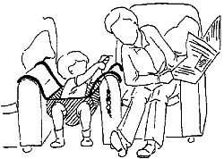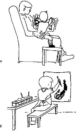 Рис. 13.9. а – ребенок сидит на подлокотнике кресла, одной ногой опираясь на его сиденье, а другой – на табурет. Папа фиксирует его таз. Малыш держит книгу вместе с папой и по папиной просьбе показывает картинки; б – табурет придвинут вплотную к стене, на которой закреплен лист бумаги. Чтобы рисовать, ребенку приходится поворачивать туловище, таким образом он тренируется контролировать положение головы и туловища.