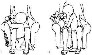 Рис. 13.4. Выбор правильного положения тела для игры. На рисунках а и б изображен маленький мальчик со спастическим тетрапарезом (тяжелой формой церебрального паралича, при которой мышечный тонус значительно повышен и в руках, и в ногах): на рисунке а показано неправильное положение тела, которое не позволяет малышу действовать руками, и неправильный выбор игрушек, которые соответствуют хронологическому возрасту ребенка, но не уровню его развития; на рисунке б положение ребенка и игрушка выбраны верно; а – вес тела ребенка приходится на крестец, поэтому, чтобы вывести вперед руки, он округляет спину и сгибает колени. Чтобы зафиксировать положение головы, малыш поднимает плечи и вытягивает подбородок вперед – шея чрезмерно разогнута, рот открыт. Края песочницы слишком высоки, и единственный способ опустить в нее руки – поднять и вытянуть их вперед, при этом руки поворачиваются внутрь, а кисти сжимаются в кулаки. В результате этого ребенок лишен ощущений, которые он должен получать во время игр с песком; б – малыш сидит у мамы на коленях, его положение устойчиво и позволяет ему наклоняться вперед, опираясь на предплечья (локти). Поэтому играя с простой игрушкой, например с мячом, – пусть он может лишь поворачивать его в руках, он заставляет мяч двигаться, видит результат, а значит и учится.