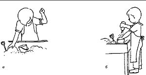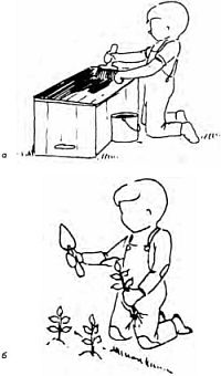 Рис. 13.13. а – ребенок красит или подметает большую деревянную или картонную коробку малярной кистью. Кисть держать удобно, она побуждает к широким и плавным движениям; б – стоя на коленях, ребенок сажает растения в саду.