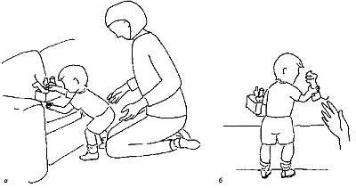 Рис. 13.15. Диван – удобная и безопасная опора для ребенка, который только учится стоять; при необходимости положите на сиденье еще одну подушку: а – ребенок учится вставать и опираться о диван при минимальной помощи взрослого; б – ребенок переносит вес, опираясь на разогнутую руку, и поворачивает туловище.