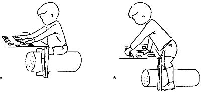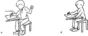 Рис. 13.42. а – на рисунке видно, как несимметричная поза отразилась на положении всех частей тела ребенка. Малыш пишет «здоровой» рукой и повернул голову в ее сторону. При этом, из-за неустойчивого положения таза, у него возникают сопутствующие реакции – мышечный тонус на спастичной стороне повышается, увеличивается отведение бедра, плечи смещаются назад, рука сгибается и кисть сжимается в кулак. Поскольку ребенок не может перемещать здоровую руку слева направо и писать, то есть не может пересекать рукой среднюю линию тела, он подвинул бумагу на край стола; б – устойчивая и симметричная поза сидя – ребенок сгибает ноги в тазобедренных суставах и наклоняет туловище вперед относительно площади опоры. Держась за край стола, он сдерживает сопутствующие реакции, которые все же возникают.