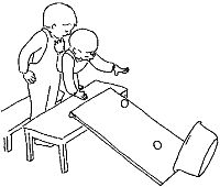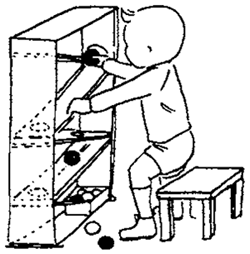 Рис. 13.19. «Бегущий мяч» – простая конструкция, с которой можно играть на разной высоте. С той же целью можно использовать комод с ящиками. В процессе игры предложите ребенку задержаться на самом трудном для него уровне или медленно переносите его действия с одного уровня на другой вверх и вниз.