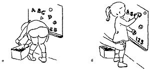 Рис. 13.20. Чтобы тело ребенка, когда он играет в положении стоя, не напрягалось, положите предметы, которыми он играет, на пол; а – обратите внимание: в результате наклона голени девочки повернулись внутрь и она опирается на носочки; б – чтобы исправить позу девочки, ее ноги надо развернуть наружу, удерживая их на уровне коленей или чуть выше – за бедра. При этом центр тяжести должен сместиться вперед. Девочку просят выпрямить ноги. Когда она наклонится за очередной буквой, ее ноги будут удерживать в правильном положении.