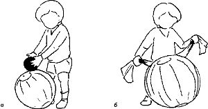 Рис. 13.27. Игры в положении стоя, которые требуют хорошей координации движений глаз-рука: а – ребенок должен установить на большой мяч маленький мячик, держа его только кончиками пальцев, а затем, медленно передвигая большой мяч ногами, не дать упасть маленькому мячику; б – ребенок должен перемещать мяч в разных направлениях с помощью полотенца, которое он держит двумя руками.