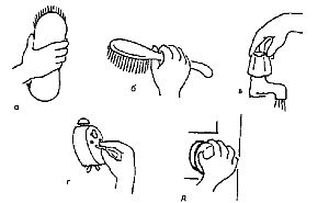 Рис. 13.32. а – захват предмета всей ладонью; б – более изящный захват; в – противопоставление большого пальца; г – более тонкое движение с противопоставлением большого пальца; д – хватательное движение в сочетании с резким поворотом кисти.