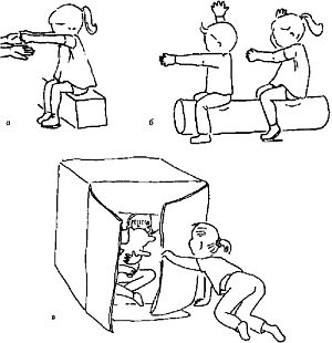 Рис. 13.35. а – движения по команде: «Положи руки на мои ладони», «А теперь – под мои ладони» и т. д.; б – повторение движений. Девочка с церебральным параличом повторяет движения брата, сначала сидя на валике за ним, а потом – сидя перед ним; в – «дом» из большой картонной коробки.