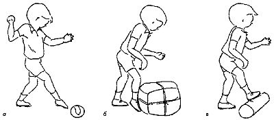 Рис. 13.46. а – ребенку со спастической гемиплегией играть в футбол с легким маленьким мячом не следует. Поскольку он не может стоять на спастичной ноге, то он будет ею пинать мяч так, как показано на рисунке, то есть отклоняясь назад, мышечный тонус на спастичной стороне повысится еще больше – нога станет более напряженной, а рука согнется еще сильнее; б – толкая ногой большой сверток или тяжелый резиновый мяч, ребенок встречает сопротивление, и для него это очень хорошая тренировка – в то время как он сгибает ногу, прикладывая усилие, чтобы сдвинуть предмет с места, вес его тела переносится вперед; в – ребенок перекатывает валик, подталкивая его пяткой.