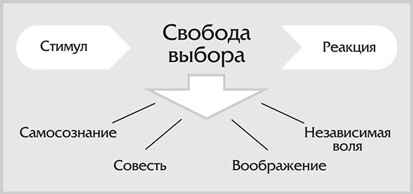 Эти четыре человеческих дарования – самосознание, совесть, творческое воображение и независимая воля – проявляют себя как раз в том промежутке, который отделяет происходящее с нами от нашей реакции на происходящее.