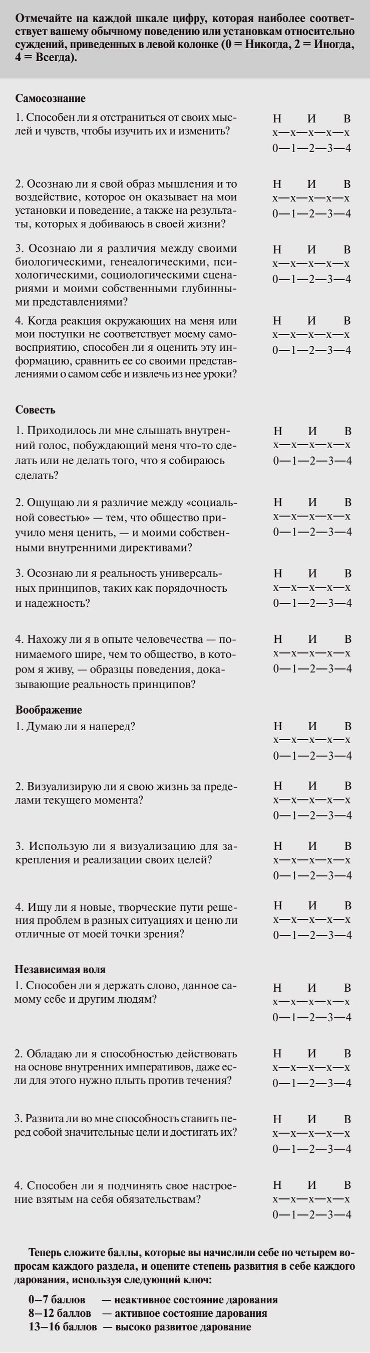 Я давал заполнить эту анкету тысячам людей, живущих в самых разных условиях, и результат этих опросов ошеломляет: среди дарований наименьшее развитие получило самосознание – способность мыслить нестандартно, отвлечься от обычных стереотипов, умение увидеть себя со стороны. Это значит, что совесть, воображение и сила воли человека остаются «в рамках» его собственного жизненного опыта и образа мышления.