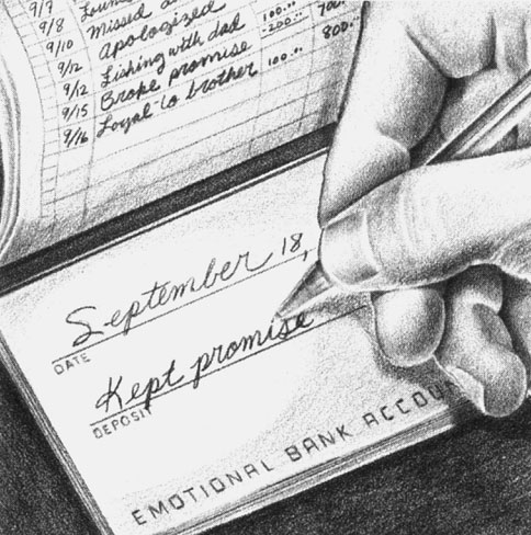 Когда в уме и сердце вы держите образ эмоционального банковского счета, проблемы и неблагоприятные обстоятельства перестают восприниматься как препятствия на вашем пути; они и есть этот путь. Повседневные отношения становятся теми возможностями, которые позволяют укрепить доверие и любовь, а жизненные испытания – средством укрепления «иммунной системы» всей семьи. В глубине души каждый человек понимает, что подобные «взносы» существенно повышают качество семейных отношений. Это идет от нашей совести, от приверженности принципам, которые в конечном счете занимают главенствующее положение в жизни любого человека.