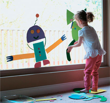 3 Фигурки из пенобумаги можно использовать на самоклеящейся пленке несколько раз, а писчая или папиросная бумага отклеивается плохо. Бумажные фигурки можно вырезать заранее, а можно поручить малышу вырезать их самостоятельно.