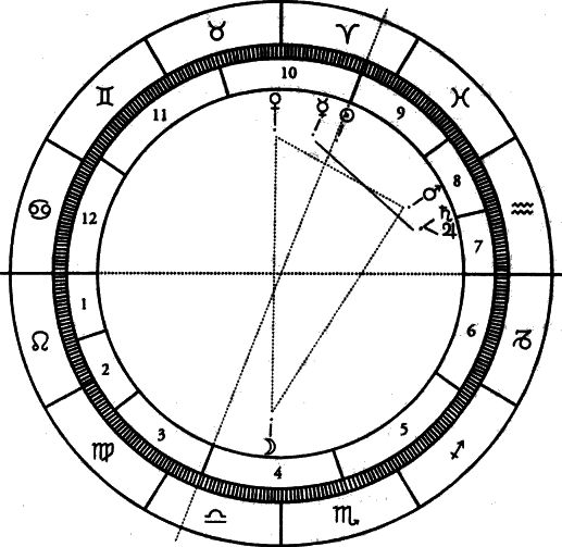 Более того, часть Судьбы была в семнадцатом градусе Девы в двенадцатом доме, а Меркурий в конце своего движения приближался к началу обратного пути и вредил асценденту.