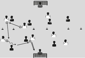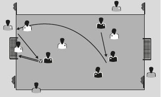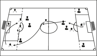 ХОД: В углах поля находятся игроки, исполняющие роль подающих мяч в центр. В пространство этих секторов нельзя вбегать полевым игрокам обеих команд. В каждой атаке должно присутствовать эффективный пас в один из двух углов, а потом подача мяча в центр штрафной партнерам. Выигрывает команда, которая забьет больше голов.