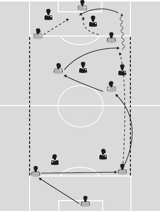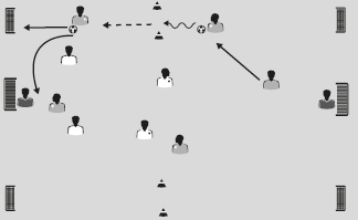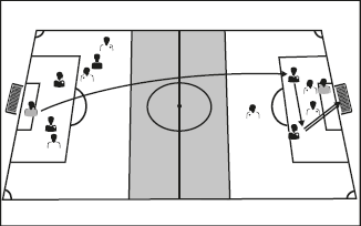 ХОД: В игре участвуют два коллектива, в одном из них 6 игроков, в другом 7, которые атакуют большие ворота с вратарем. Играют позиционное нападение с завершающим ударом по воротам. Защищающиеся должны выполнить перехват и провести быструю контратаку на одни из трех ворот, установленных на другой стороне поля. Выигрывает коллектив, который больше забьет.