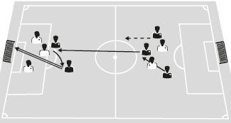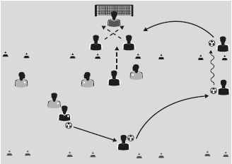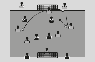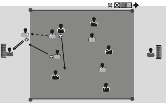РЕКОМЕНДАЦИИ: Определить поле перед большими воротами, куда не могут вбегать участники. Поощрять передачи с дальнего расстояния с выводом на ударную позицию.