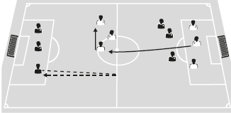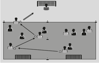 ХОД: Играет совершенствует способность принятия быстрых решений по получению мяча, а также его сохранения, когда игра идет в преимуществе над противником. Один из коллективов играет вместе с вратарями на удержание мяча в преимуществе 5x4. Они получат очко за выполнение 12 передач, а защищающий коллектив, получив мяч, атакует ворота, которые находятся, на противоположной стороне спортивной площадки. Они получат очко, если забьют гол. Число контактов с мячом зависит от технических умений участников.