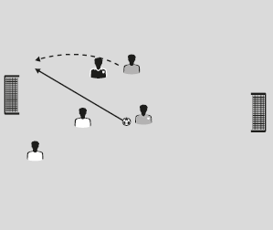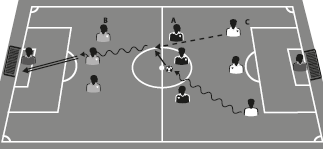 ХОД: В игре участвуют три коллектива по 3 участника каждый. Избранная тройка (A) атакует ворота в определенном направлении, которые защищает одна из двух других троек (B). Когда атакующий (A) коллектив забьет, играют в противоположном направлении, атакуя ворота, которые защищает уже третий коллектив (C). Если защитники (B) отберут мяч, то становятся автоматически нападающими и нападают на ворота третьей команды (C). Вратари играют за защитников.