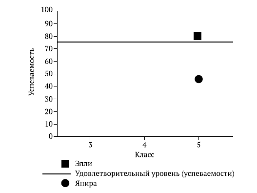 Почему взаимозависимость социально-экономического статуса и успеваемости в школе заслуживает более внимательного изучения? Как показывают примеры Яниры и Элли, которые вполне укладываются в картину, представленную на рис. 1.1, место жительства ученика часто определяет, сколько баллов он (она) наберет при тестировании на успеваемость. Если взглянуть на график успеваемости Яниры и Элли за 5-й класс, то они могут выглядеть, как это представлено на рис. 1.2.